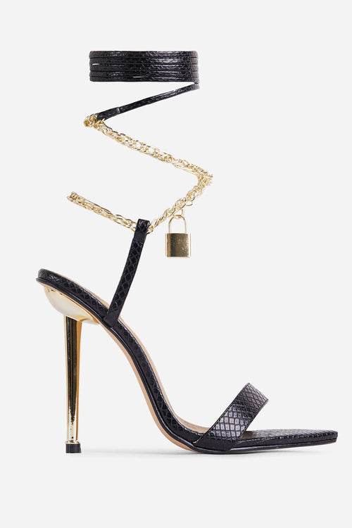 Heel height: 11.5cm Faux leather upper Adjustable around the ankle lobster claw closure chain Embellished stone detailing Crystal embellishment detailing Pointed open toe High stiletto heel