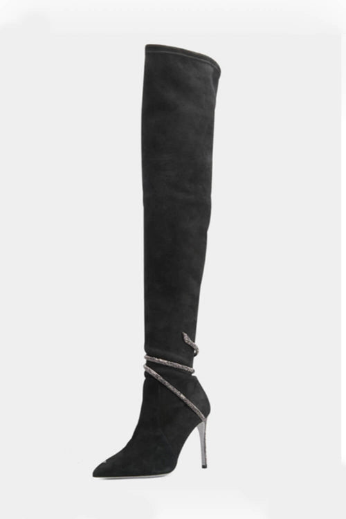 Heel height: 11.5cm Diamante detailing Embellished with micro crystals Over the knee height Pull-on fit Pointed toe Stiletto heel
