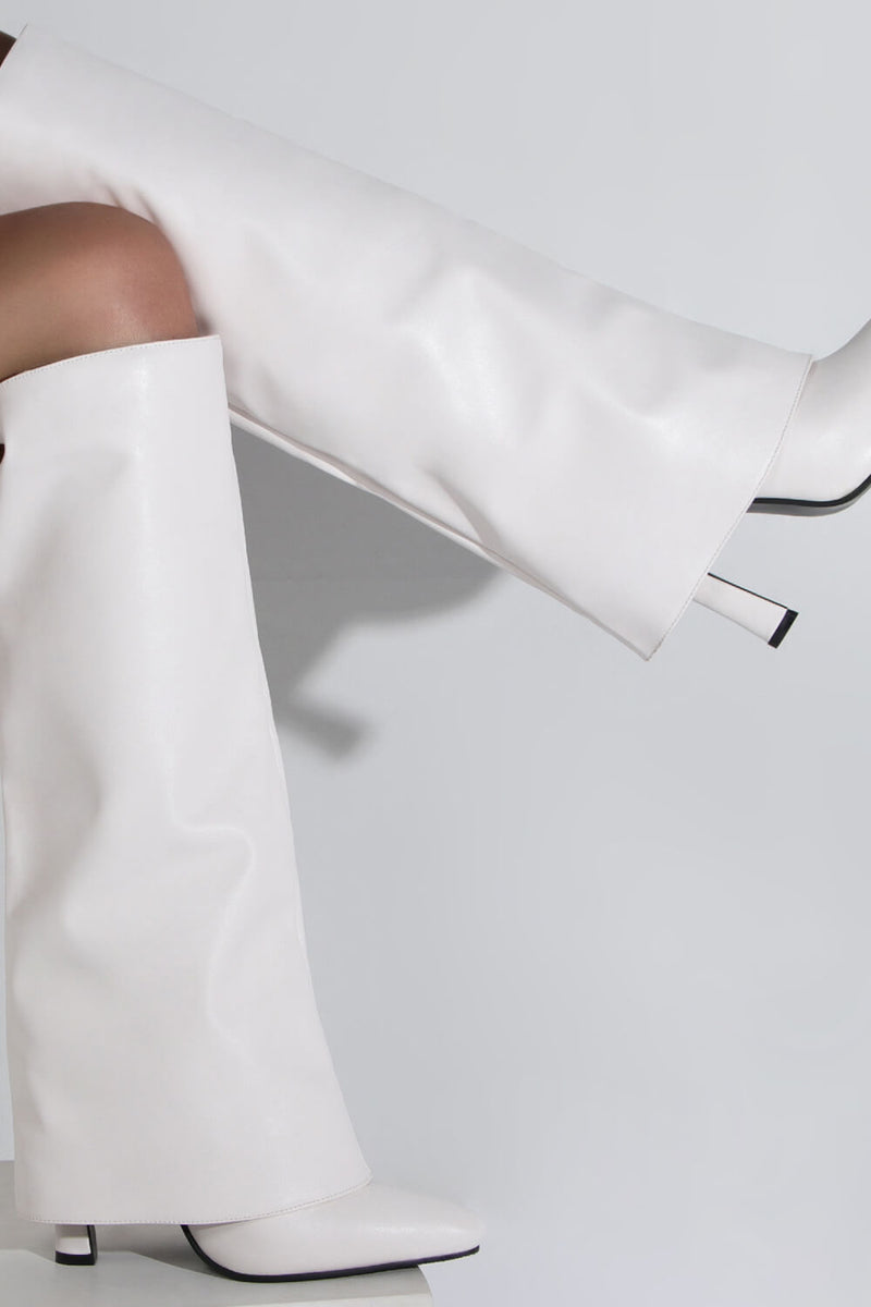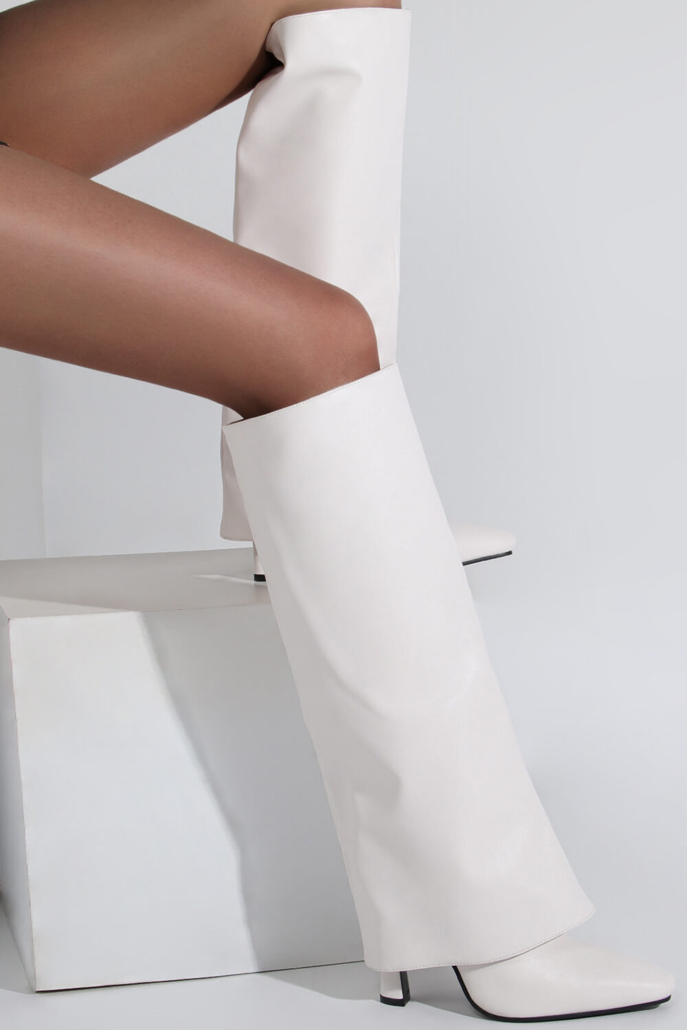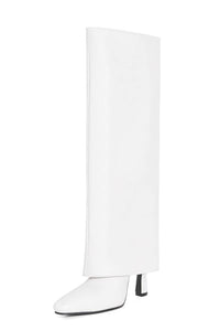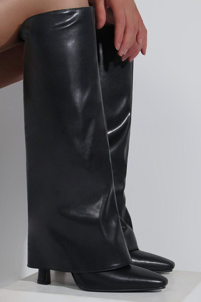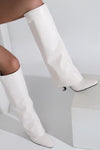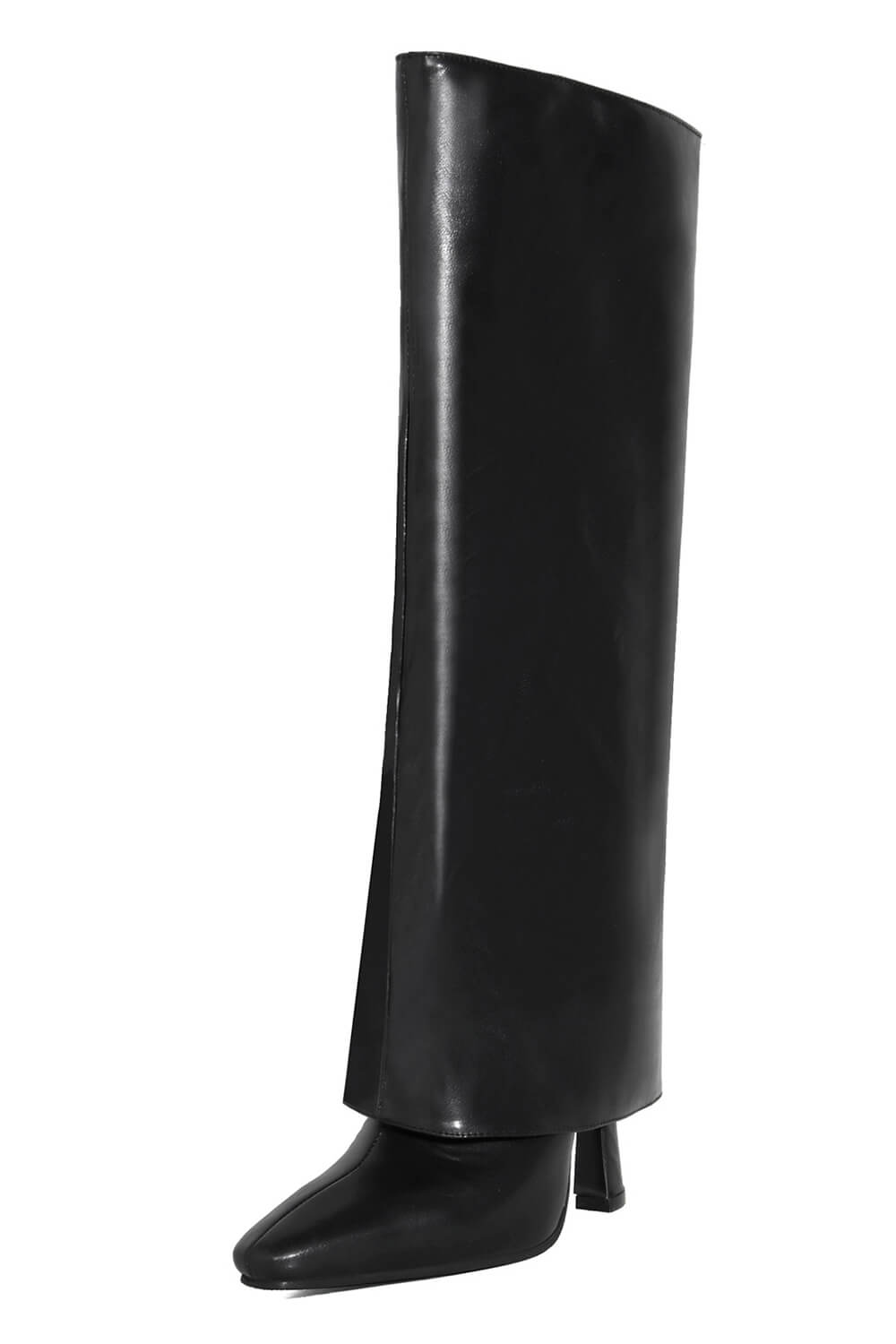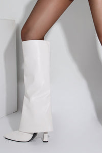 Faux Leather Wide Fit Folded Over Heeled Knee High Long Boots - Black/White