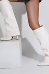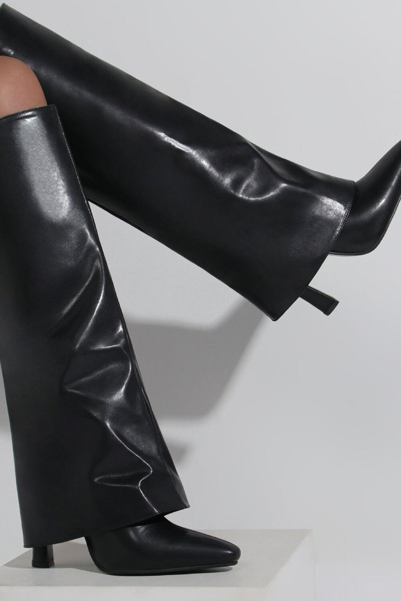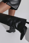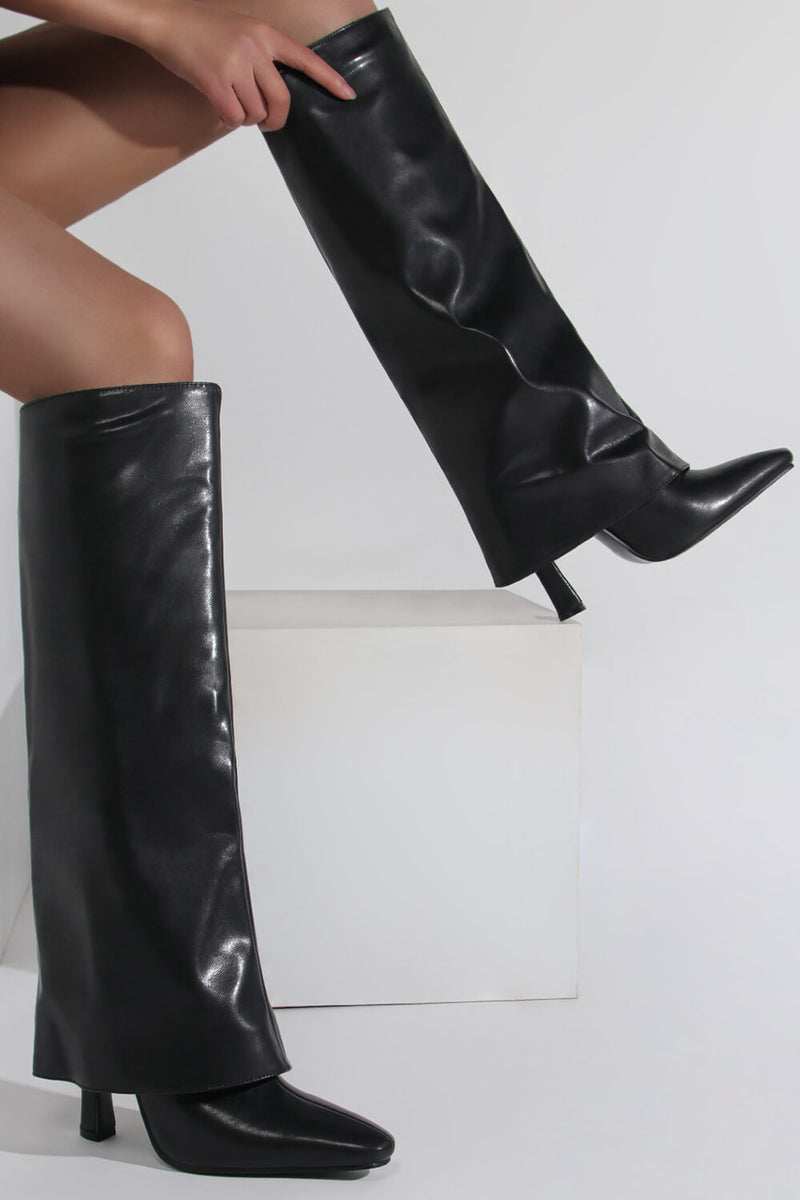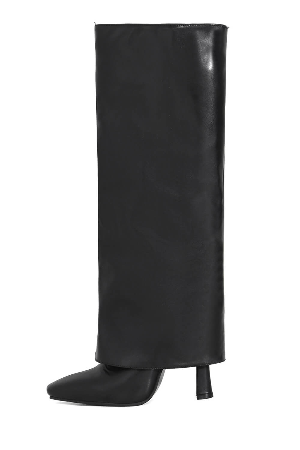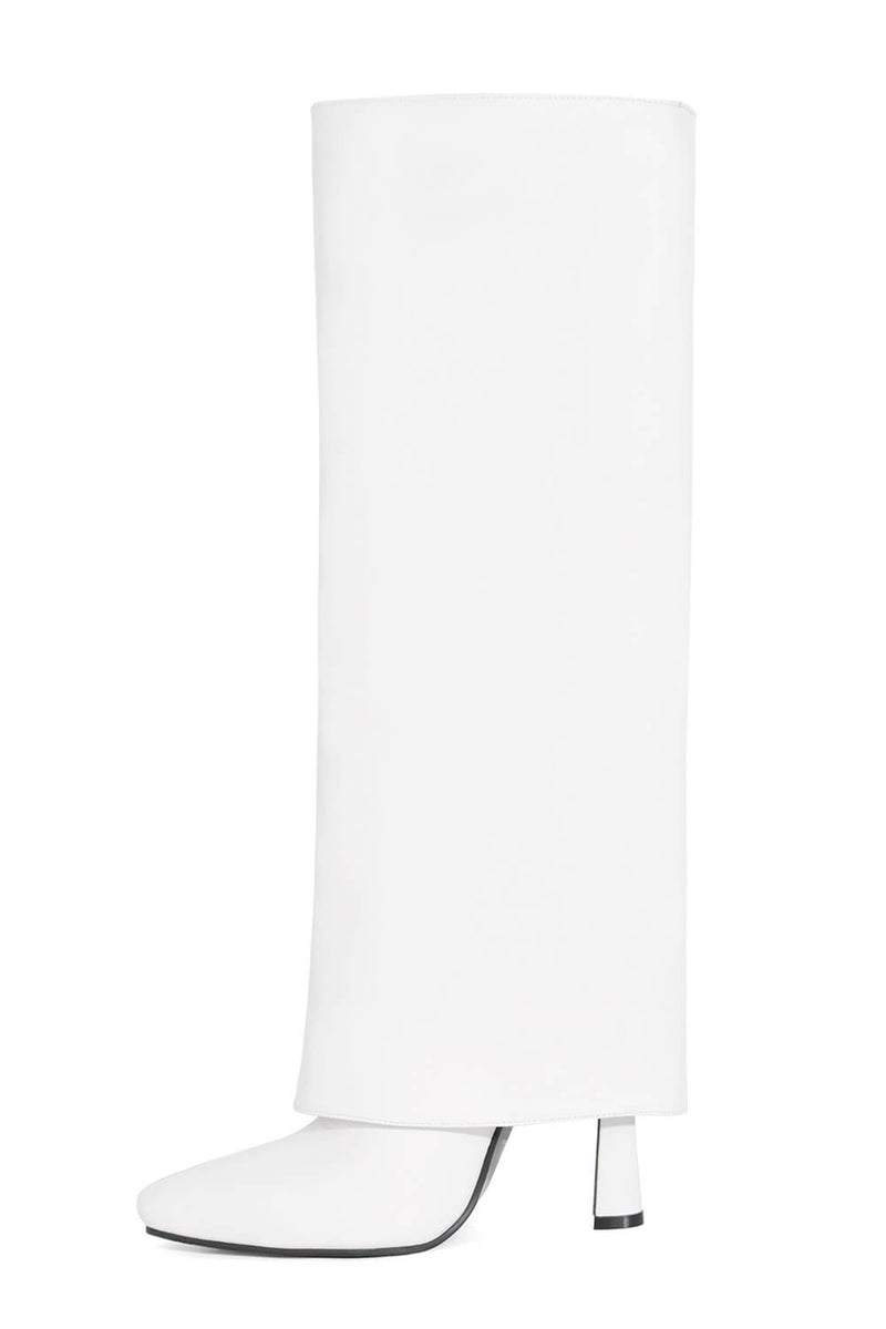 Faux Leather Wide Fit Folded Over Heeled Knee High Long Boots - Black/White