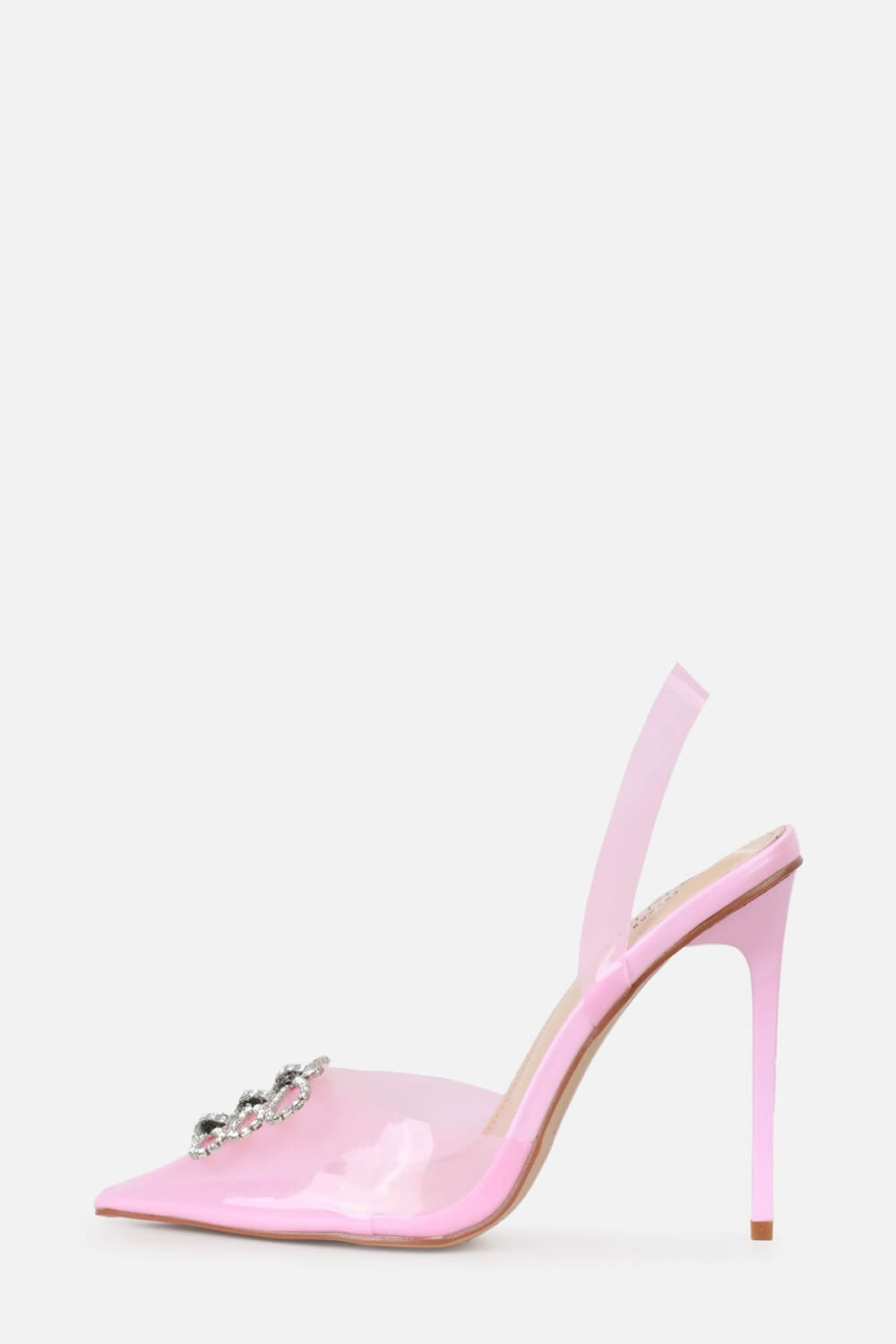 Heel height: 12.5cm Diamante bow detail Perspex upper and heel Diamante wrap around ankle strap Square toe Stiletto heel