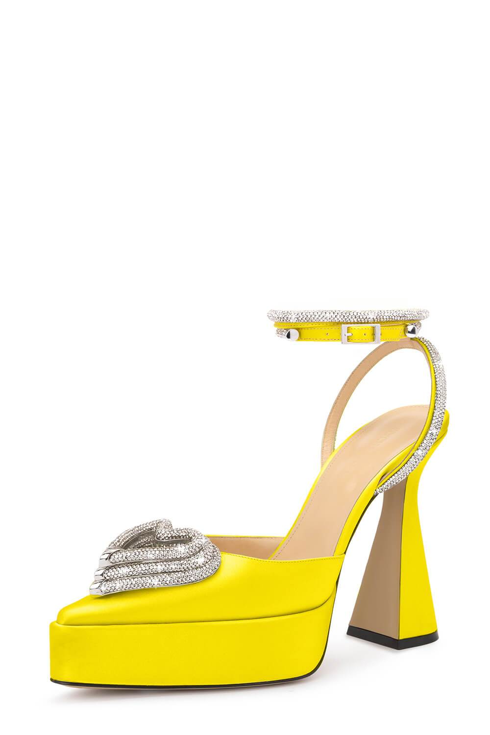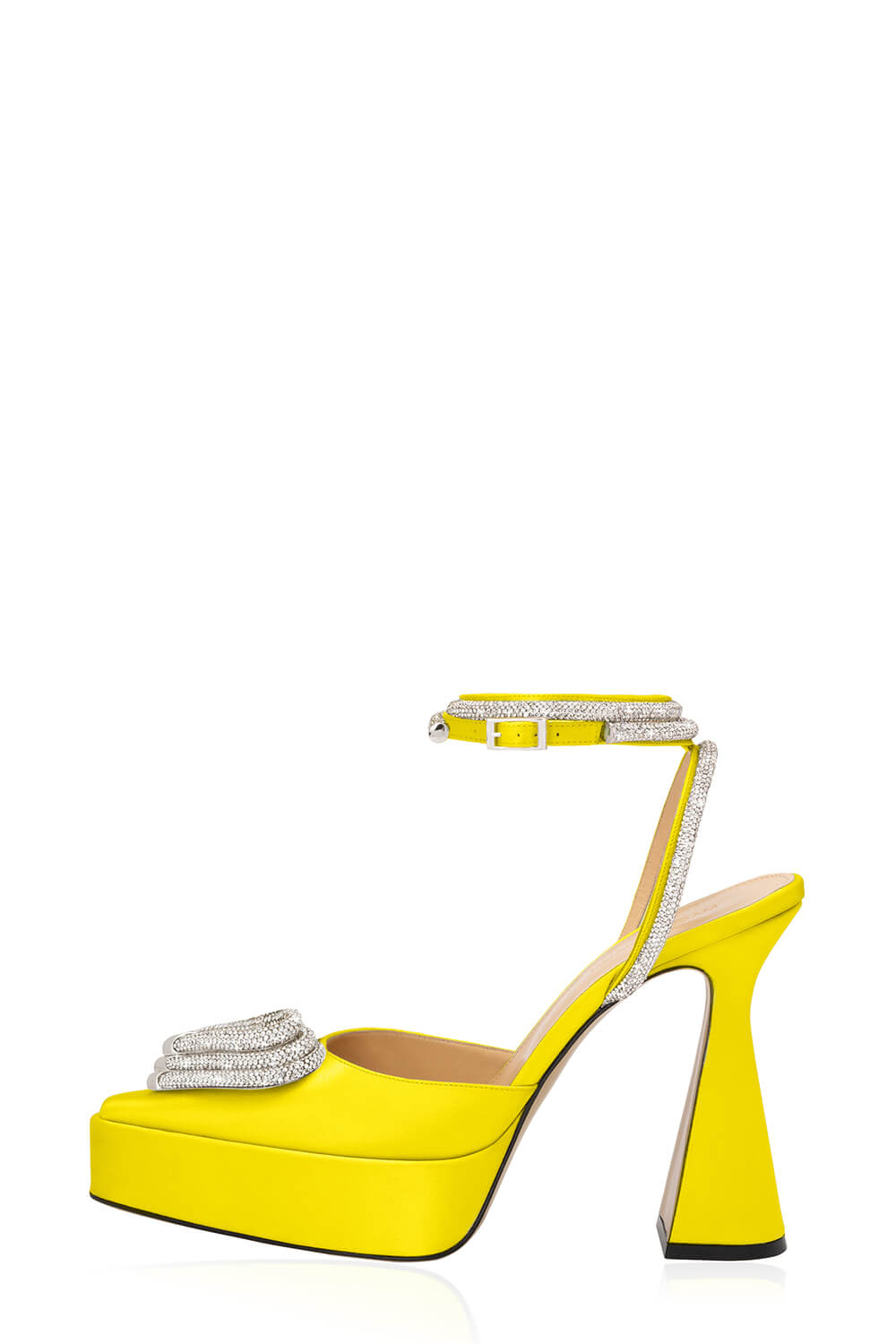 Heel height: 12cm Satin upper Lace-up detailing Diamante bow detail Diamante wrap around ankle strap Pointed toe Clear perspex heel