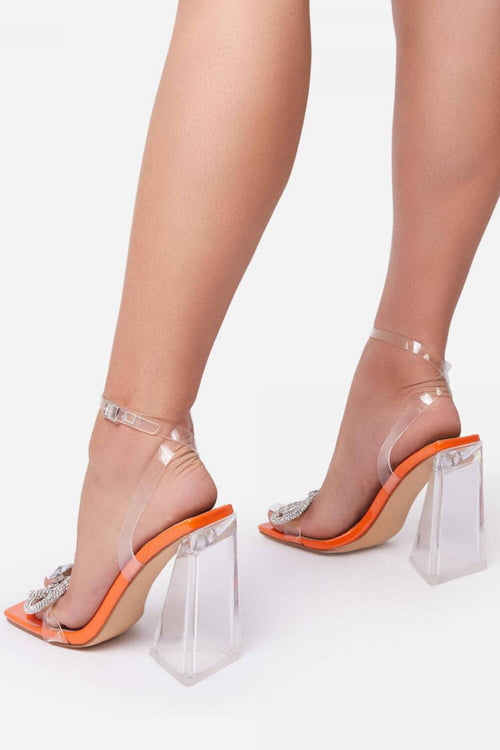 Diamante bow detail Perspex upper and heel Diamante wrap around ankle strap Square toe Stiletto heel