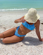 Sky Blue Leaves Print Ruched High Leg Bikini Bottom