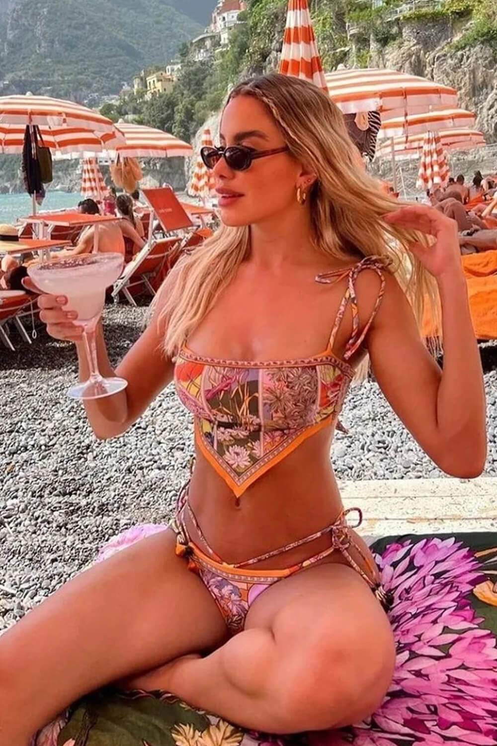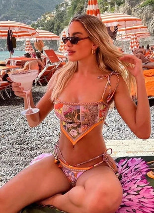 Lotus Daicy Print Bandeau Scarf String Tie Bikini Set