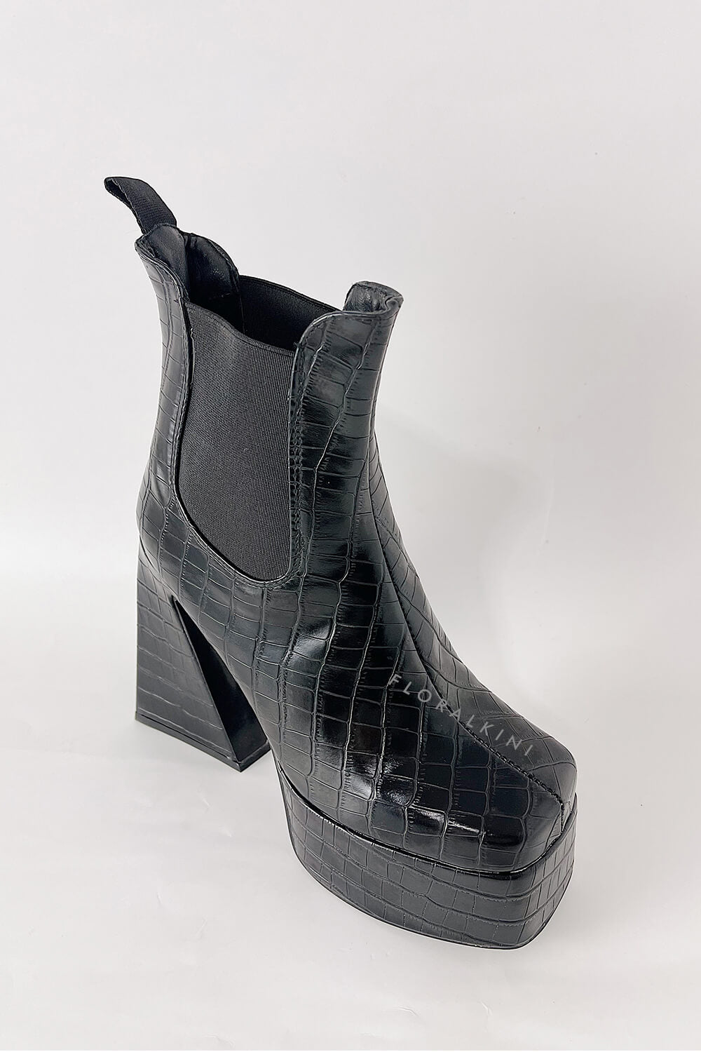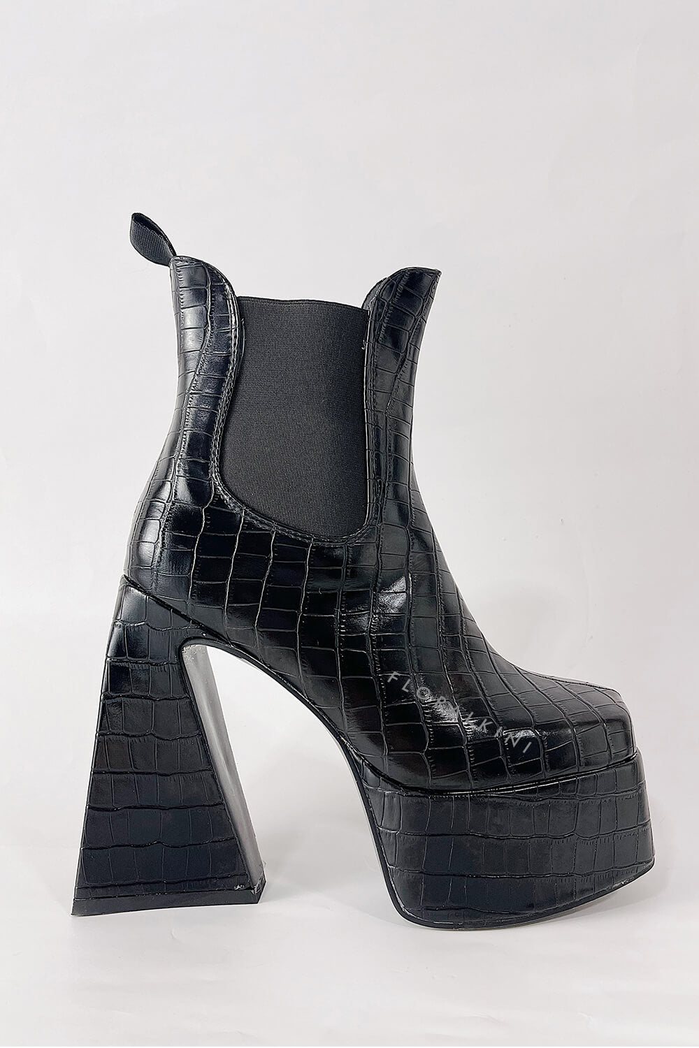 Croc Platform Square Toe Statement Block Heel Ankle Boots