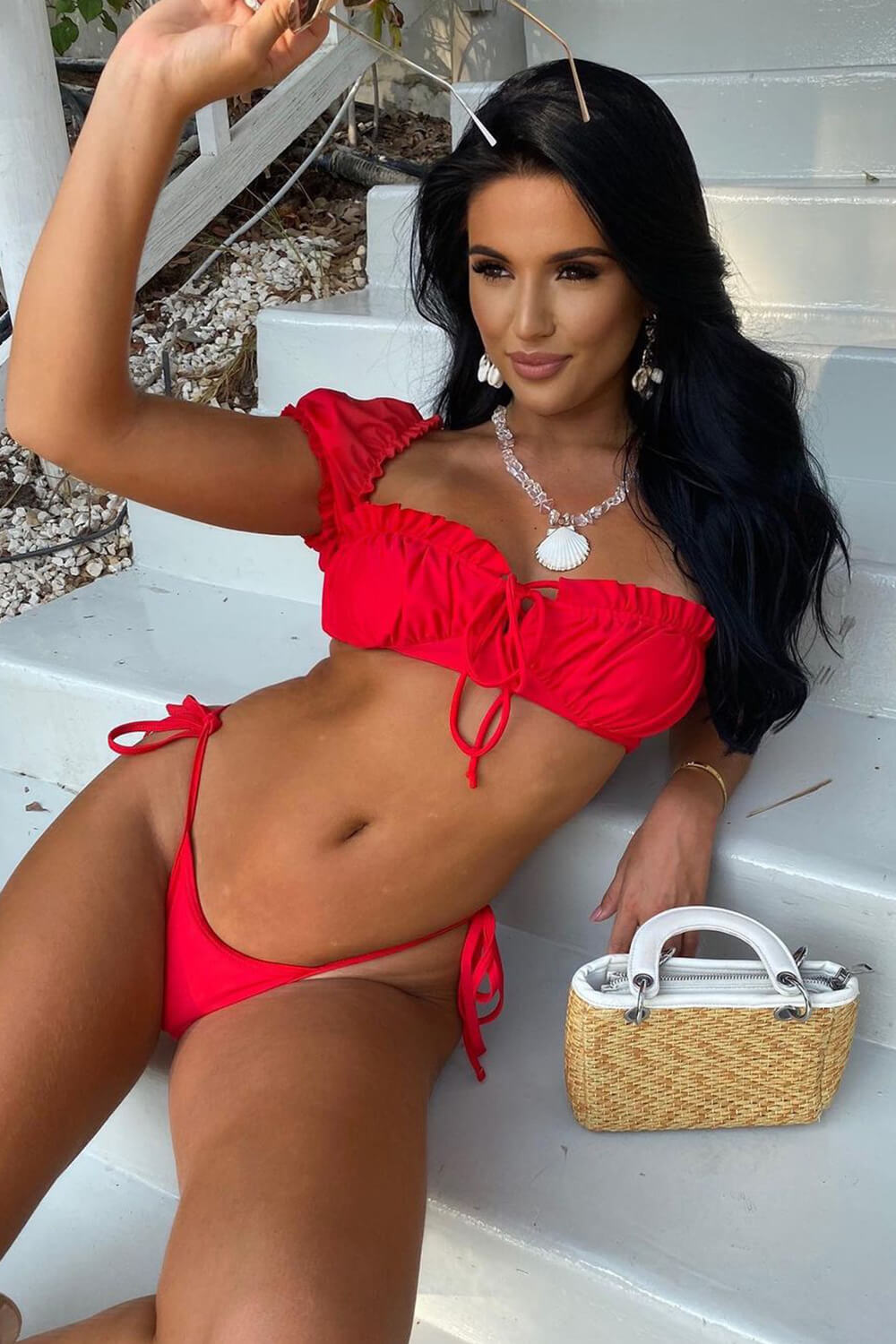 Red Puff Sleeve Ruffled Milkmaid Bardot String Tie Bikini Top