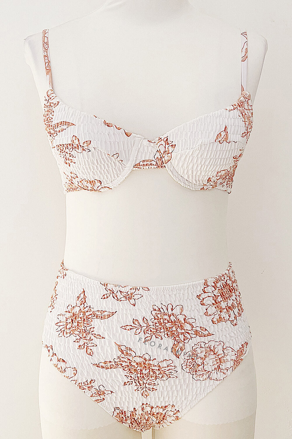 Tan Floral Ruched High Waisted Bikini Bottom