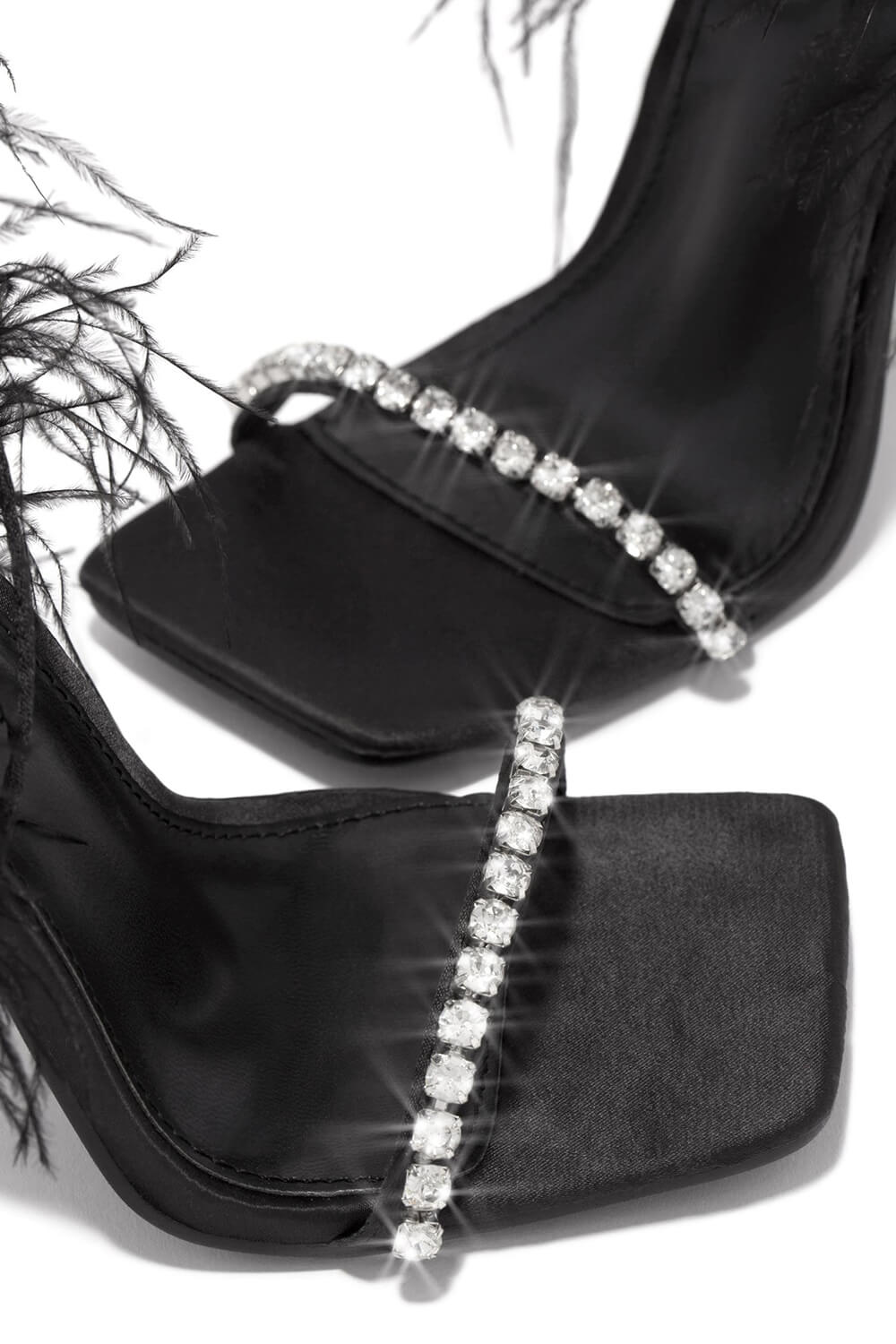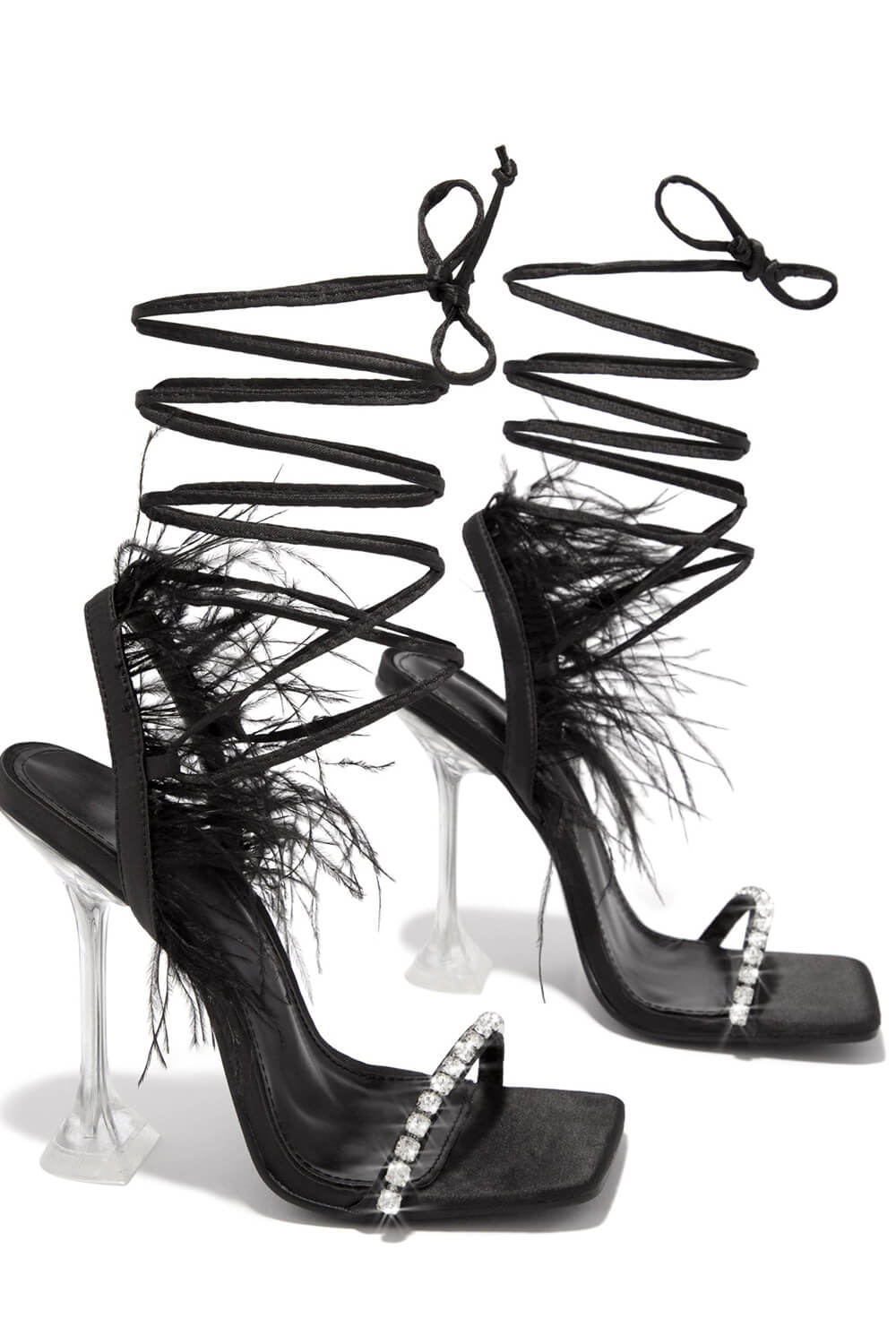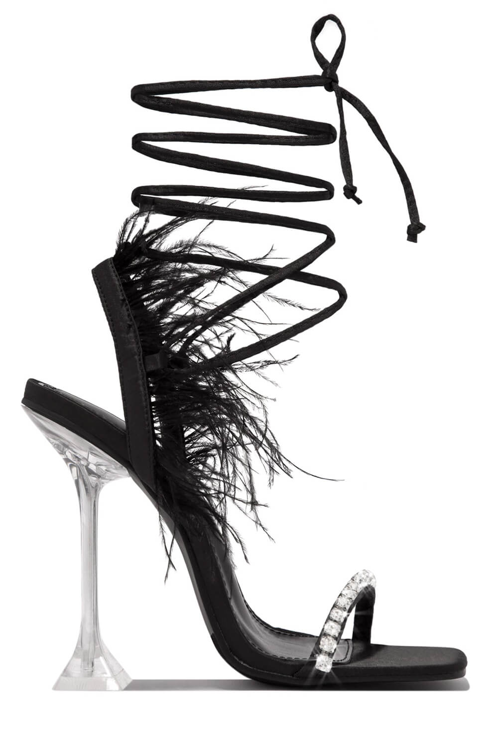 Black Lace Up Diamante Faux Feather Fur Clear Perspex Sculptured Heels