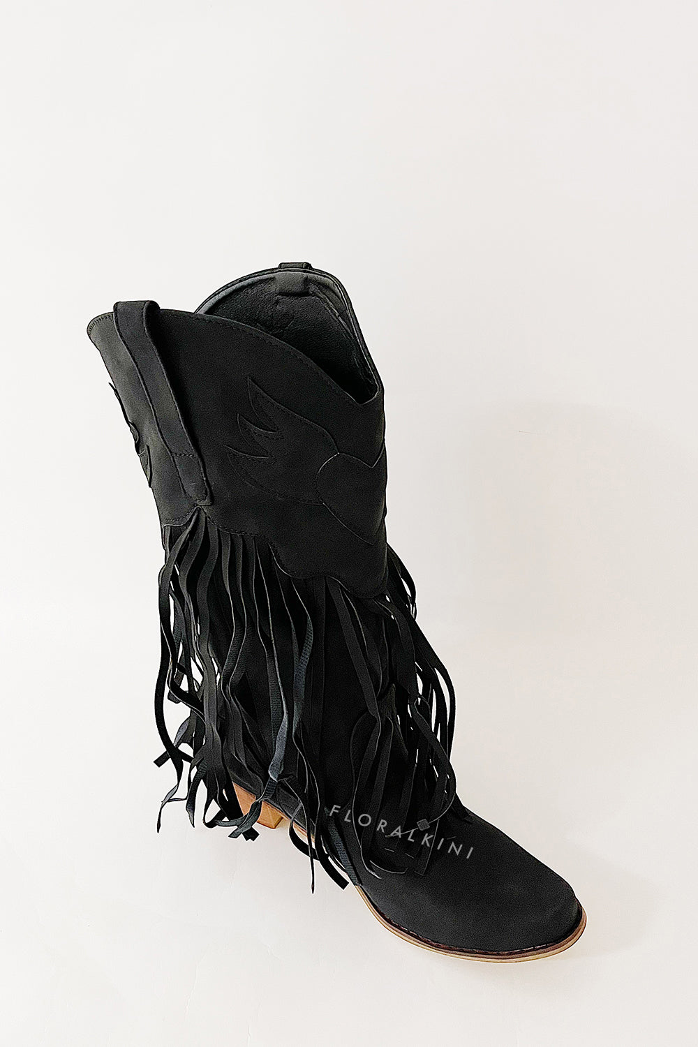 Black Faux Suede Fringe Pointed Toe Western Mid Calf Block Heel Ankle Boots