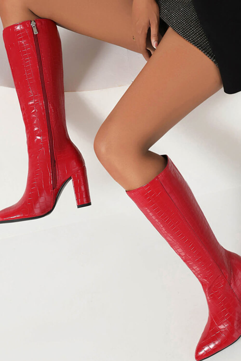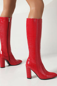Faux Croc Print Block Heel Mid Calf Knee High Boots - Red