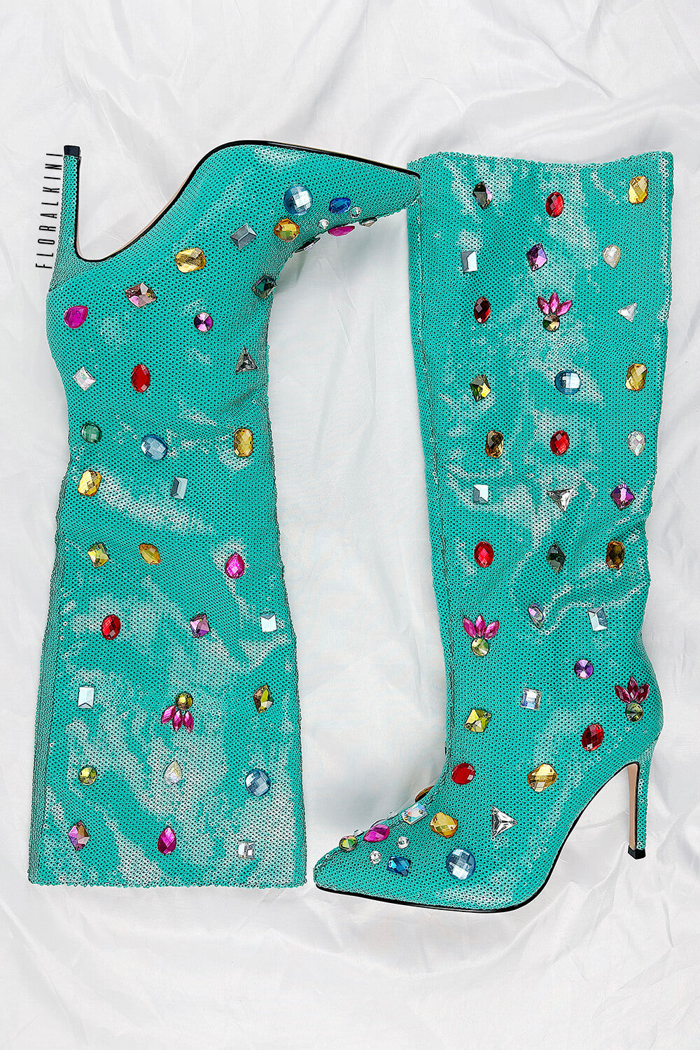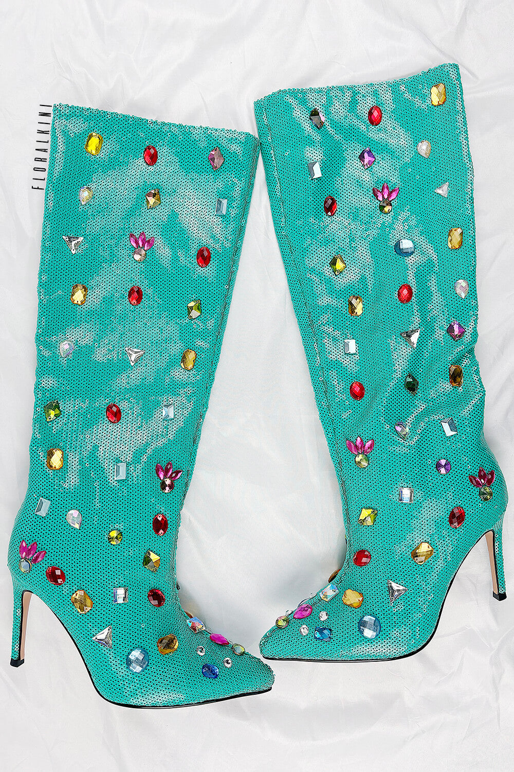 Green Sequined Pointed Toe Stiletto Heel Over The Knee Boots
