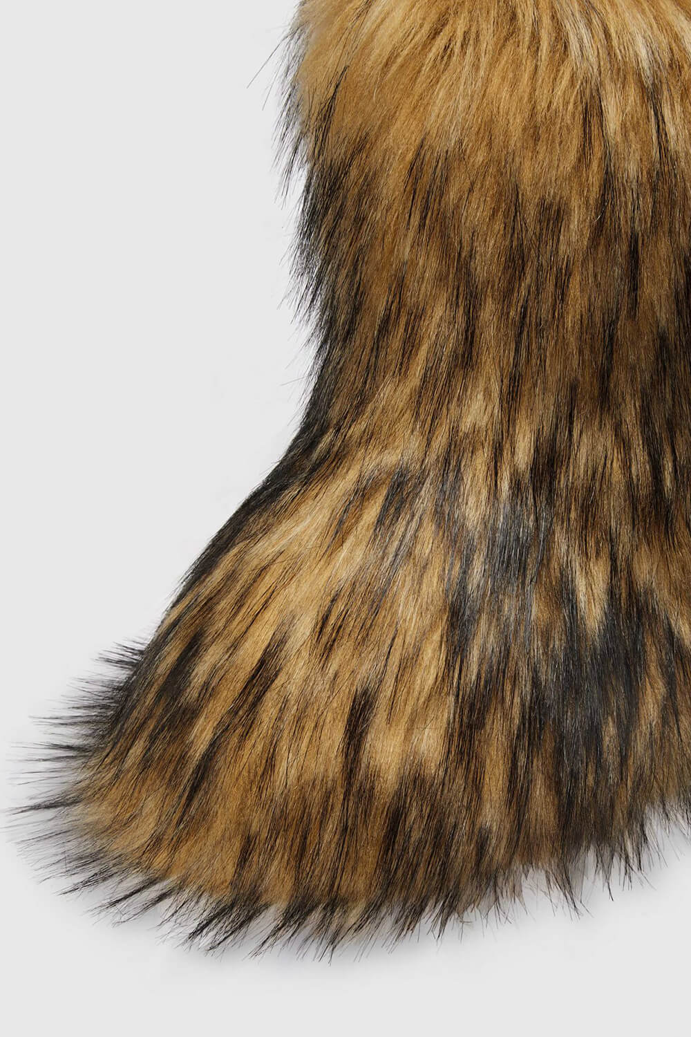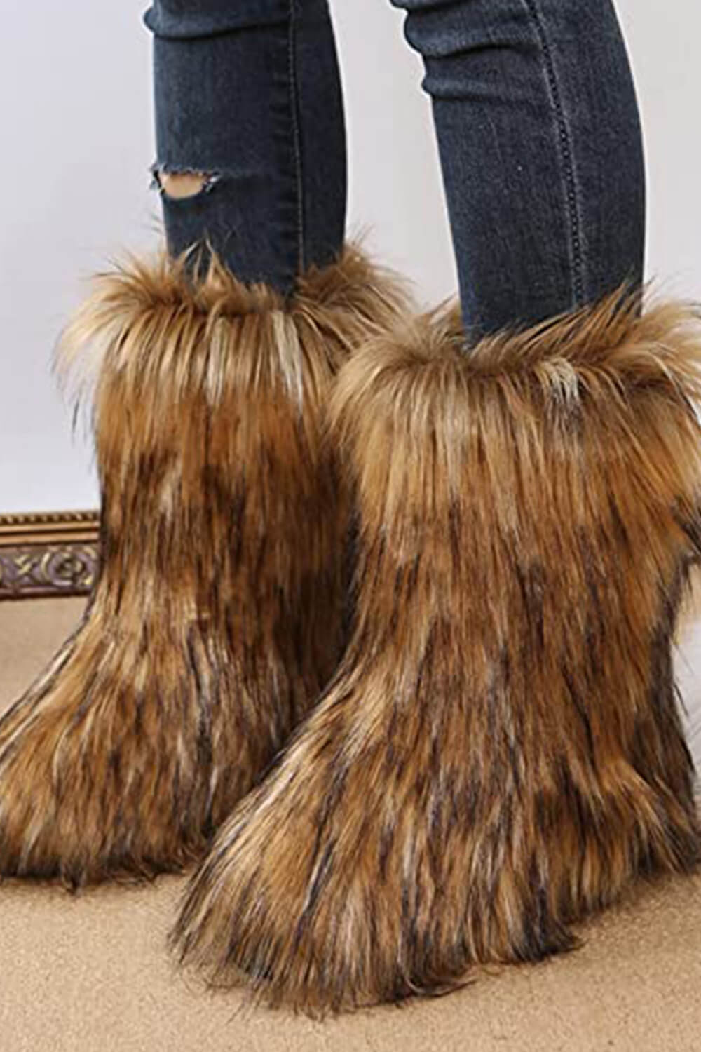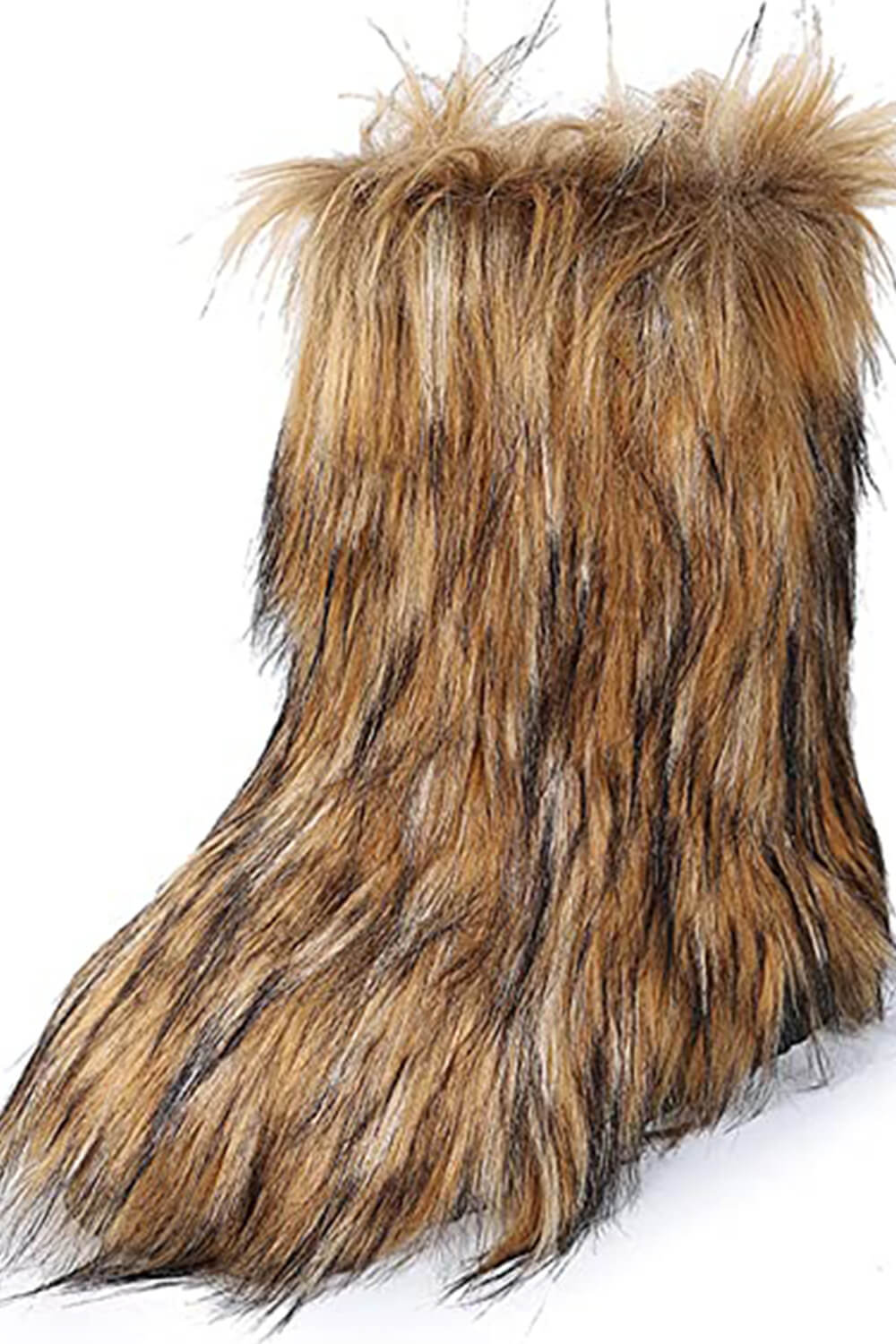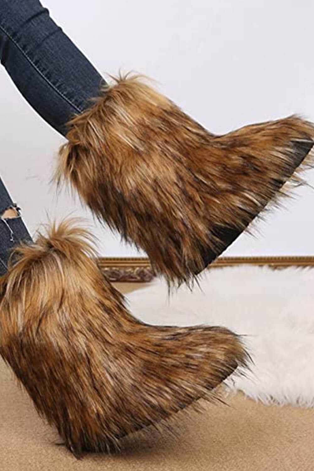 Black Furry Faux Fur Mid Calf Bootie - Brown