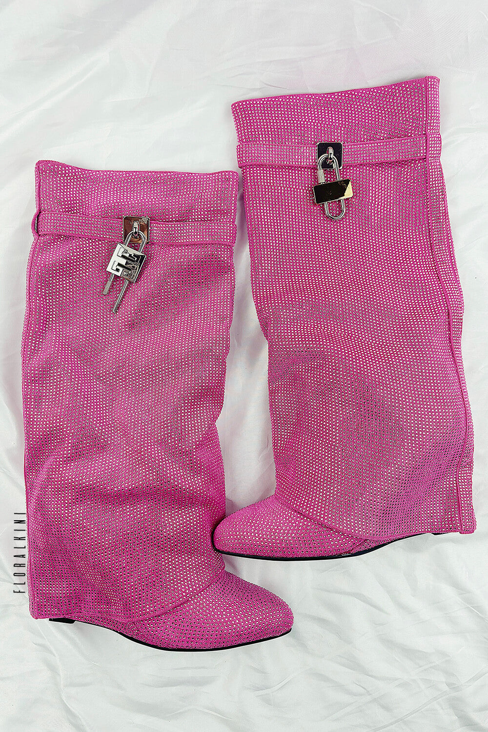 Gem Embellished Diamante Padlock Detail Folded Biker Knee High Boots - Pink