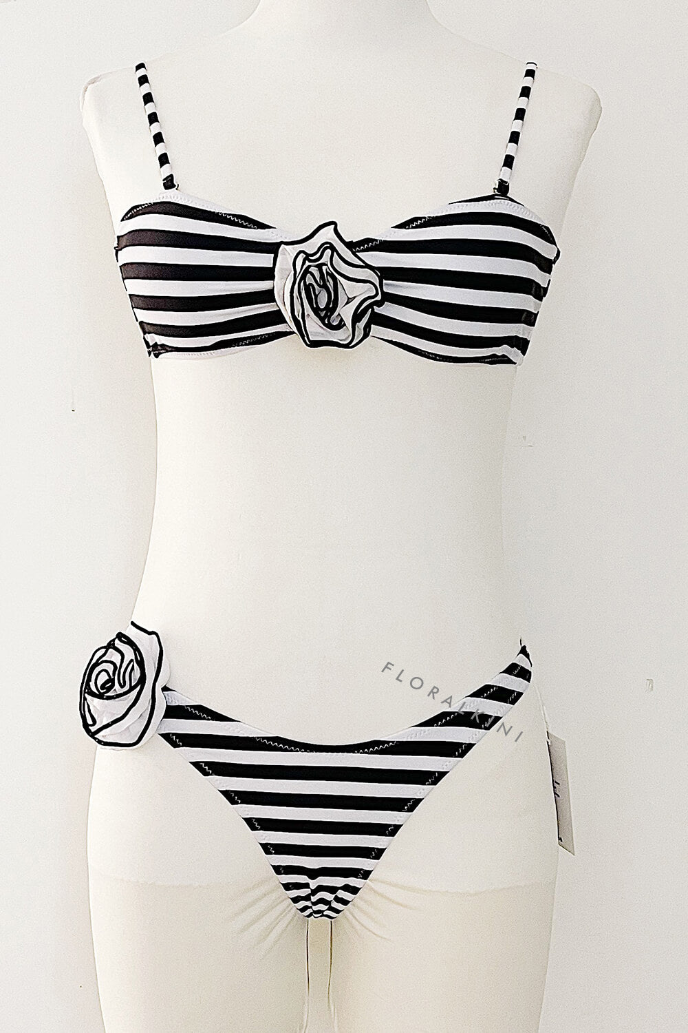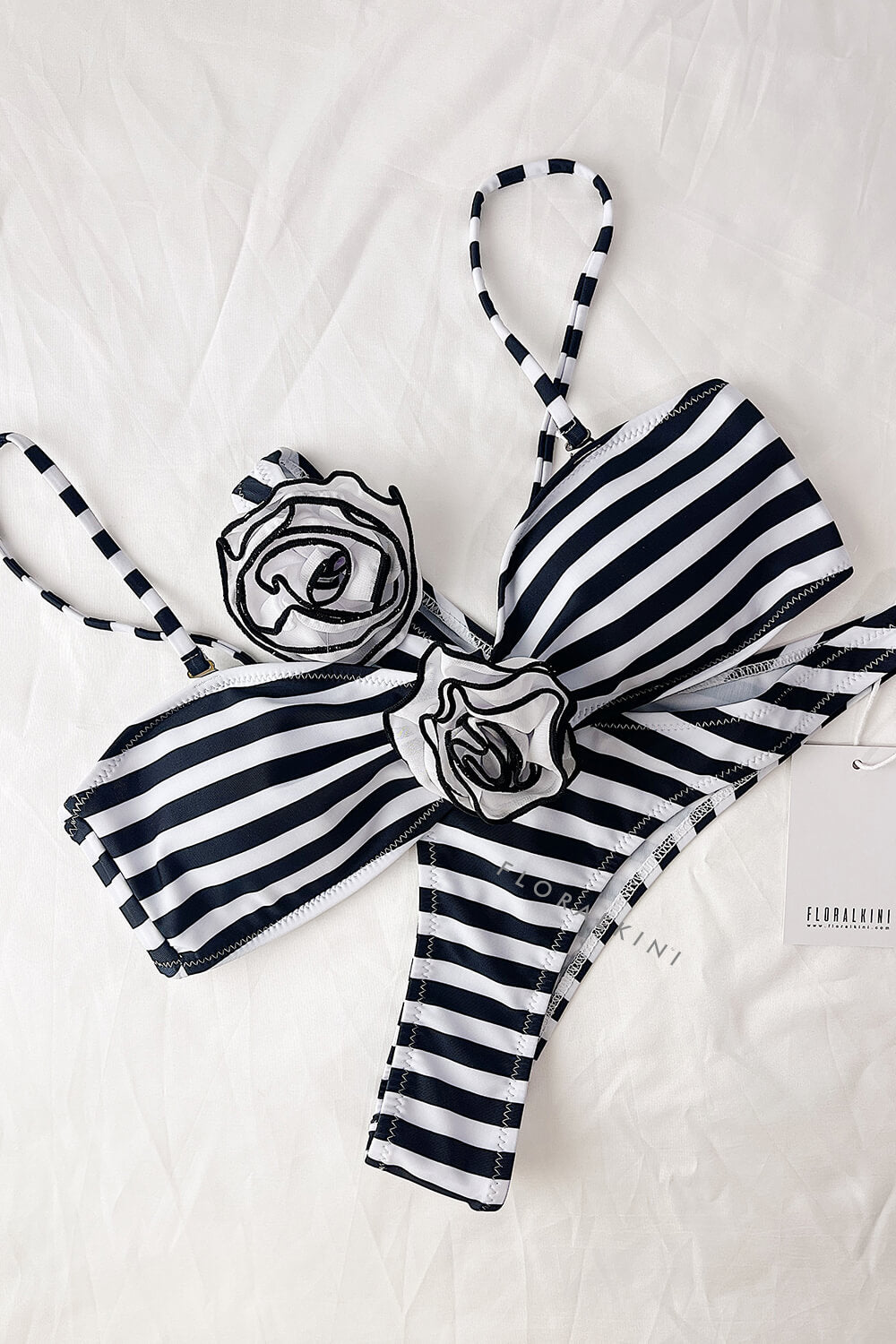 Rosette Bandeau High Waisted Bikini Set - Cream Black Stripe