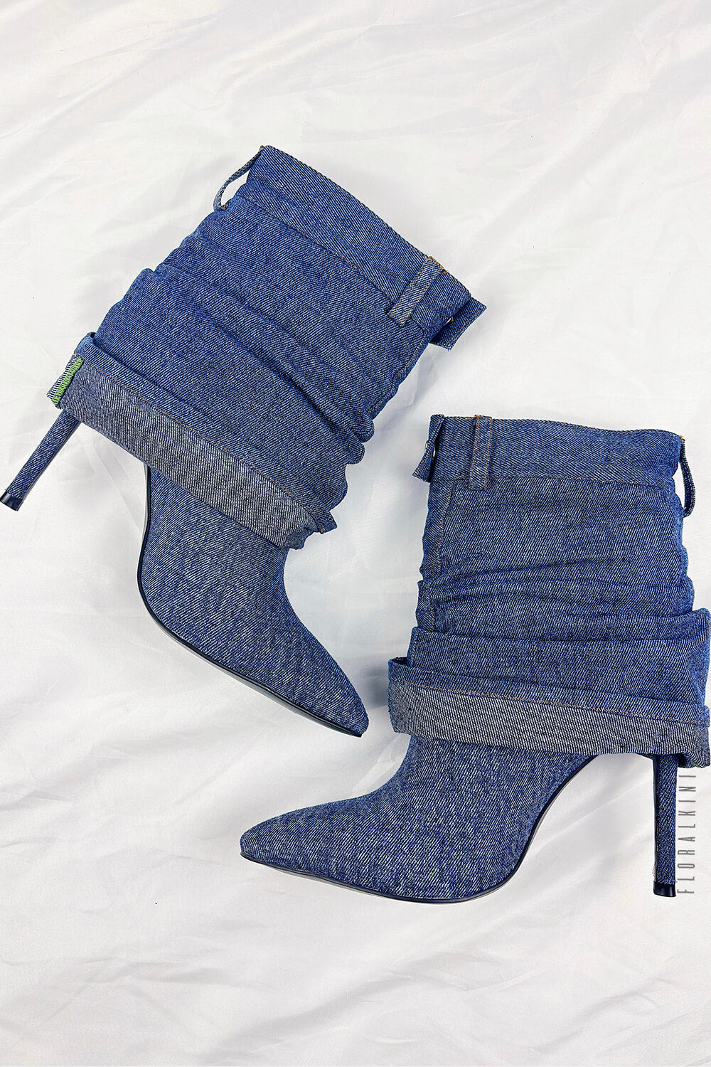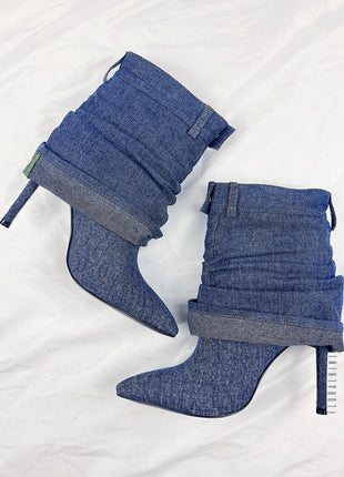 Denim Folded Mid Calf Pointed Toe Stiletto Heel Boots