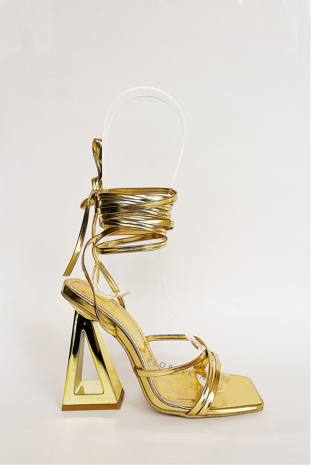 Lace Up Square Toe Gold-Tone Block High Heels - Gold