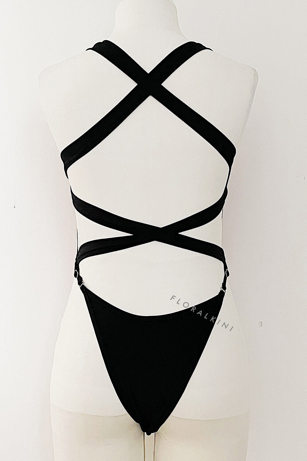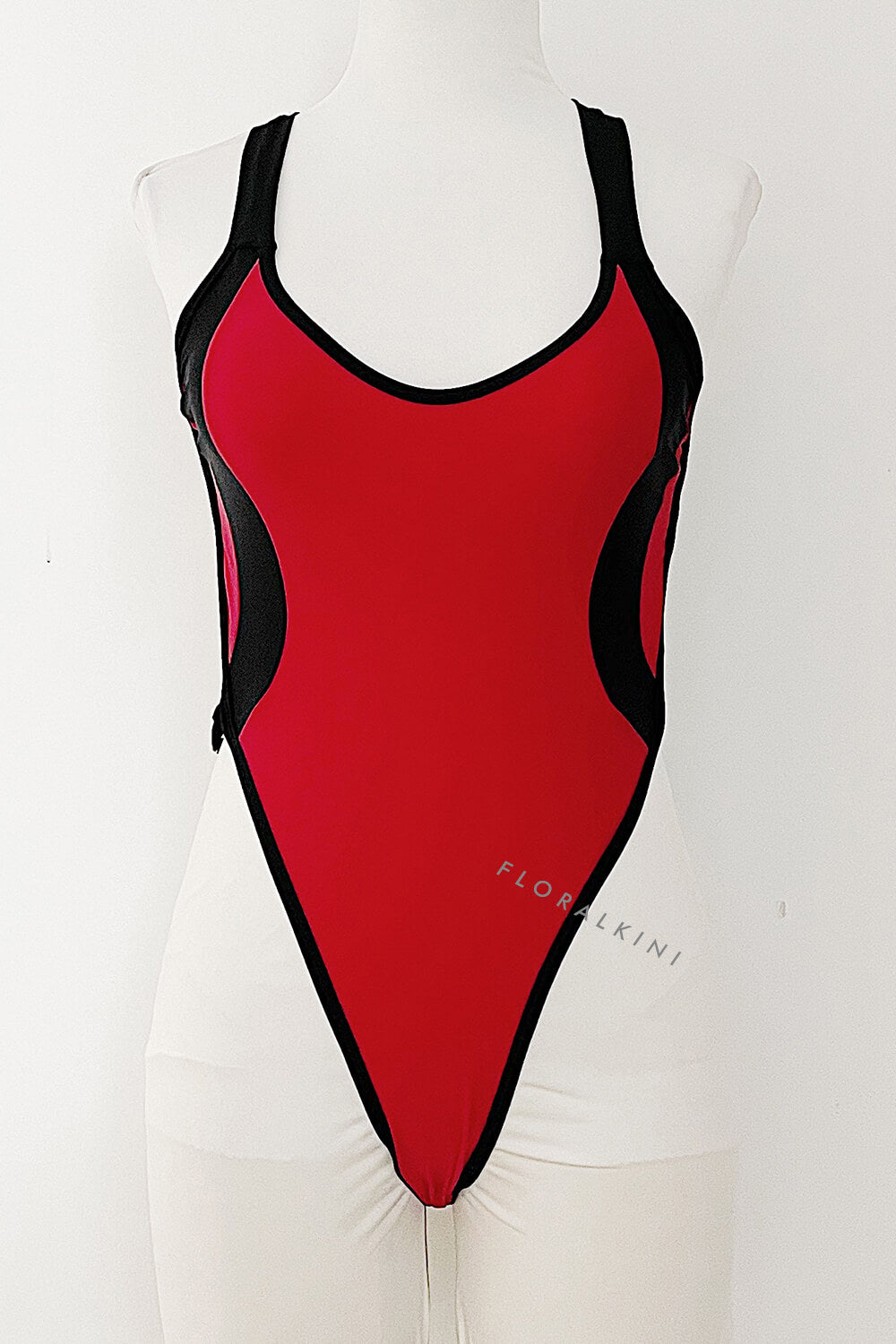 Color Block V Neck High-Cut One Piece Swimsuit - Black & Red