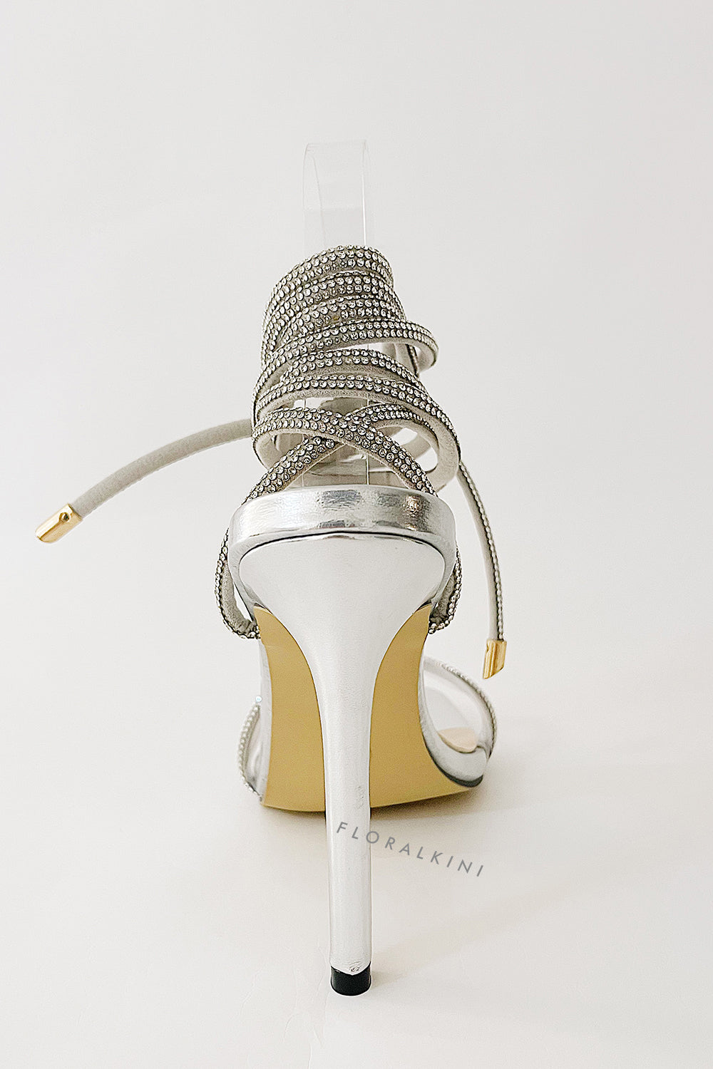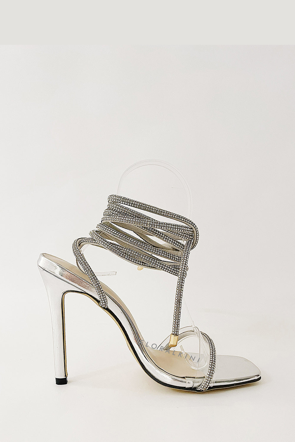 Diamante Embellished Lace Up Square Toe High Heels - Silver