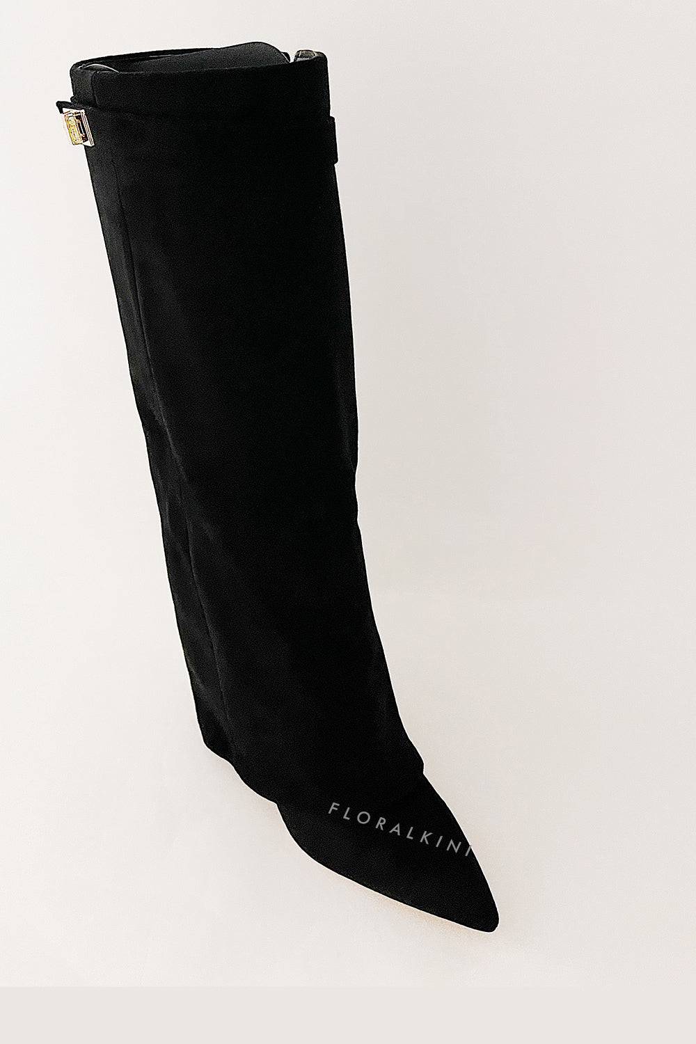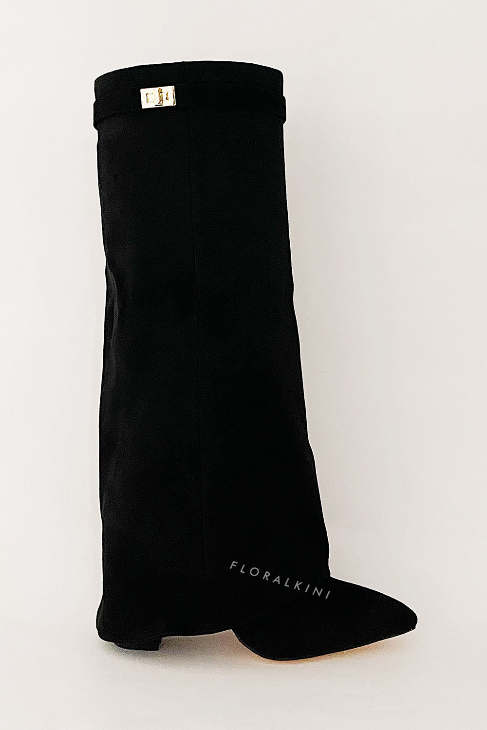 Faux Suede Fold Over Metal Lock Detail Knee High Boots