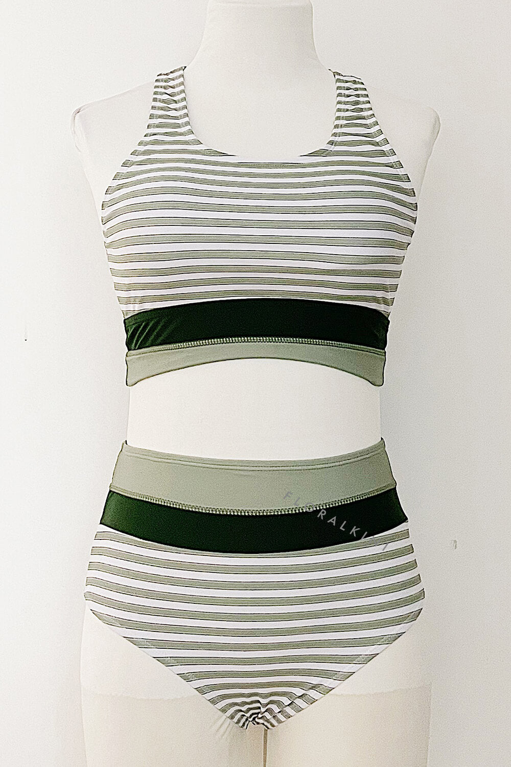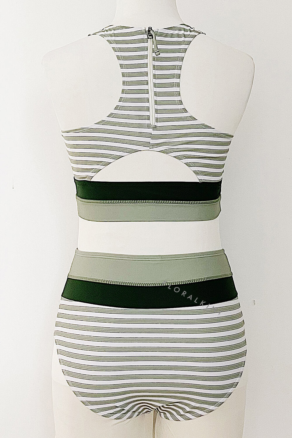 Striped Colorblock Cut Back Crop High Waisted Bikini Set