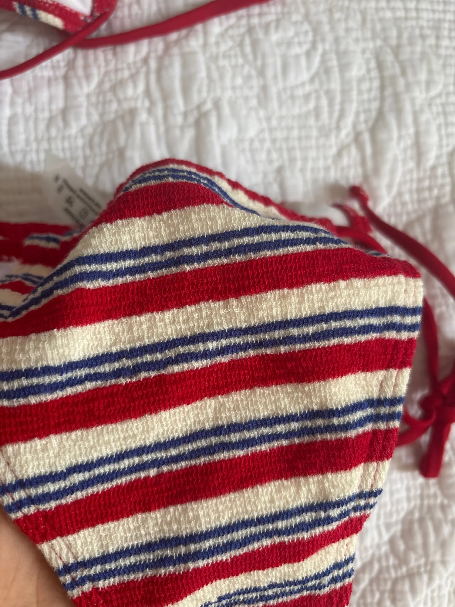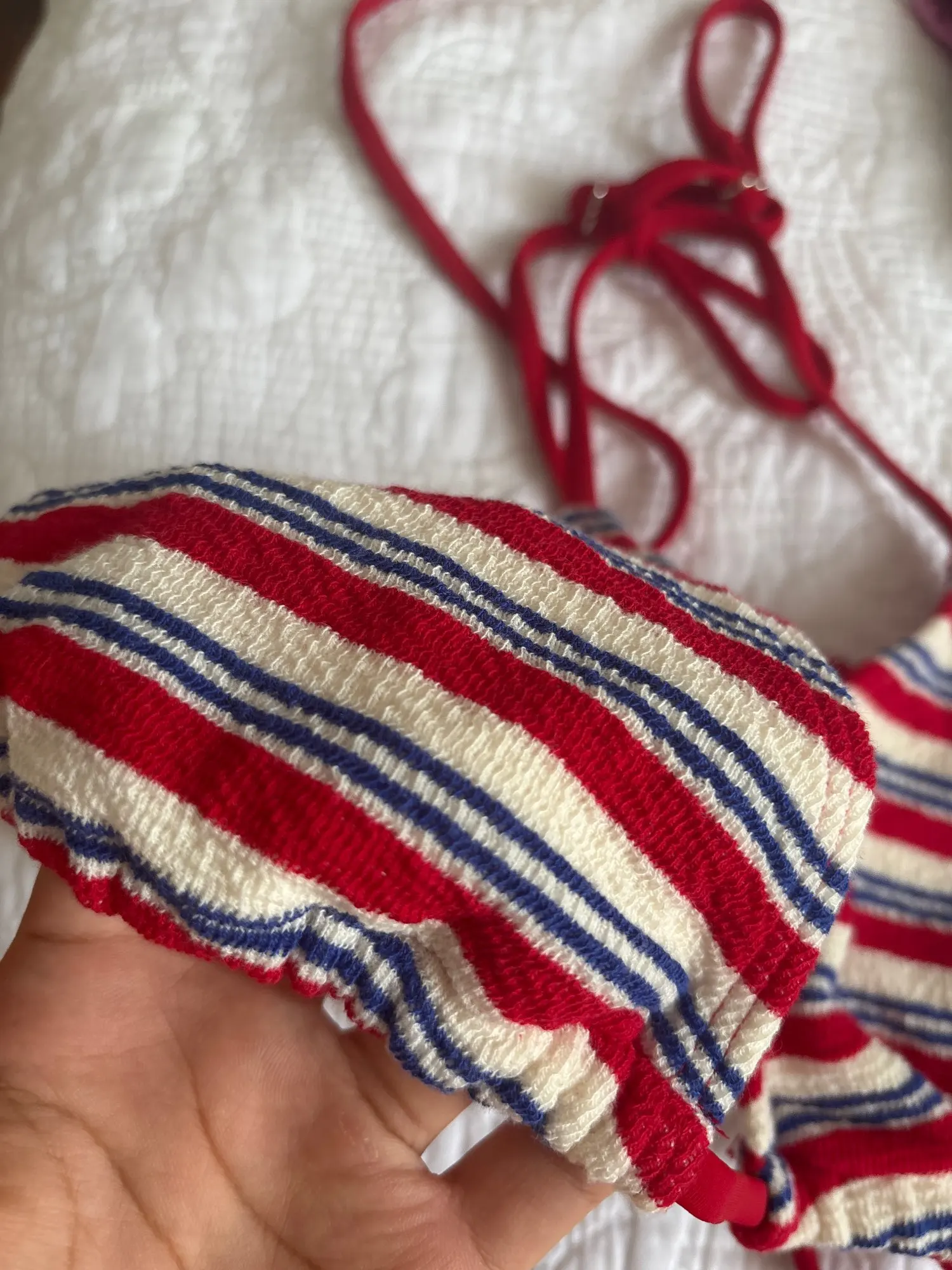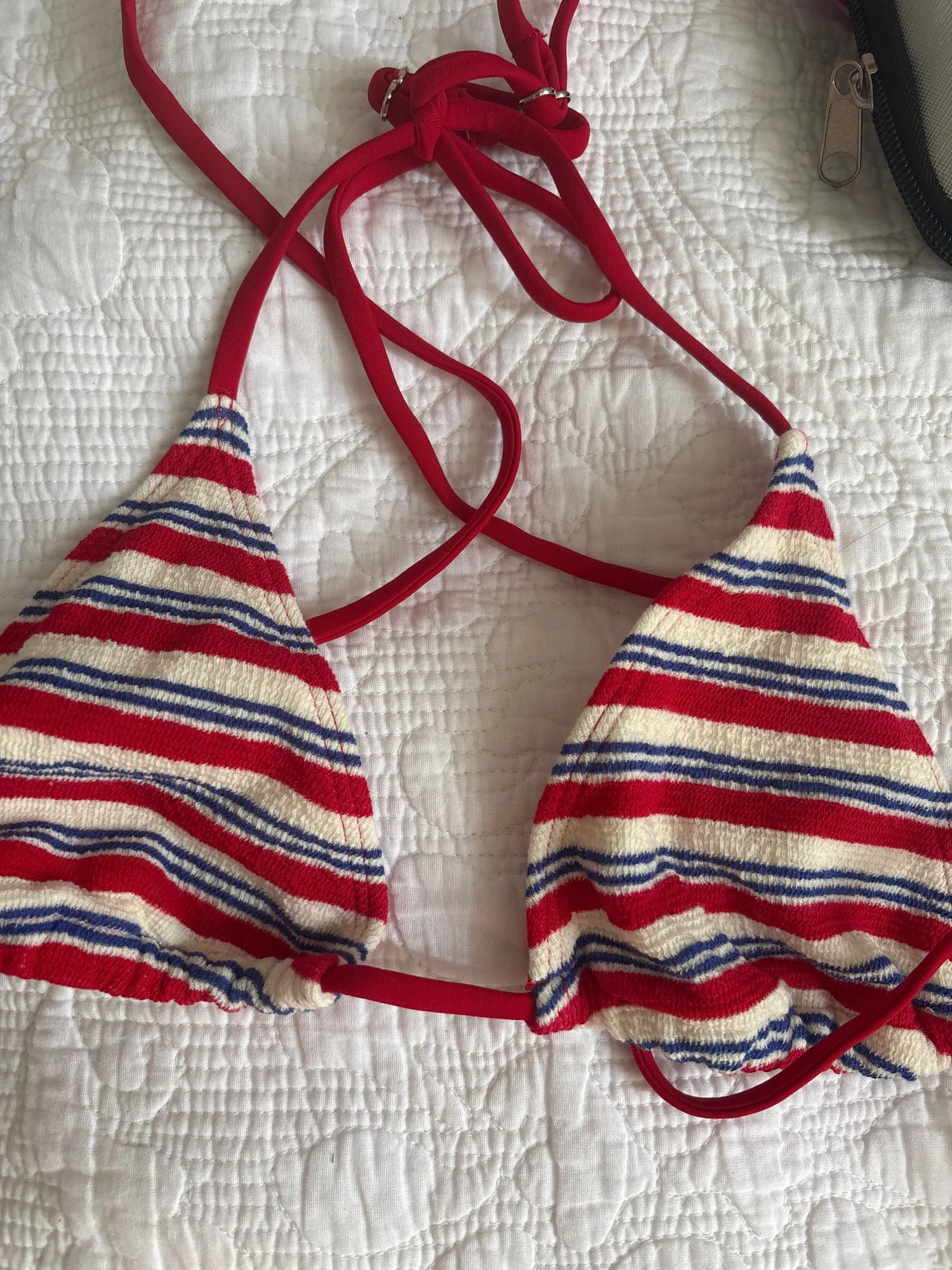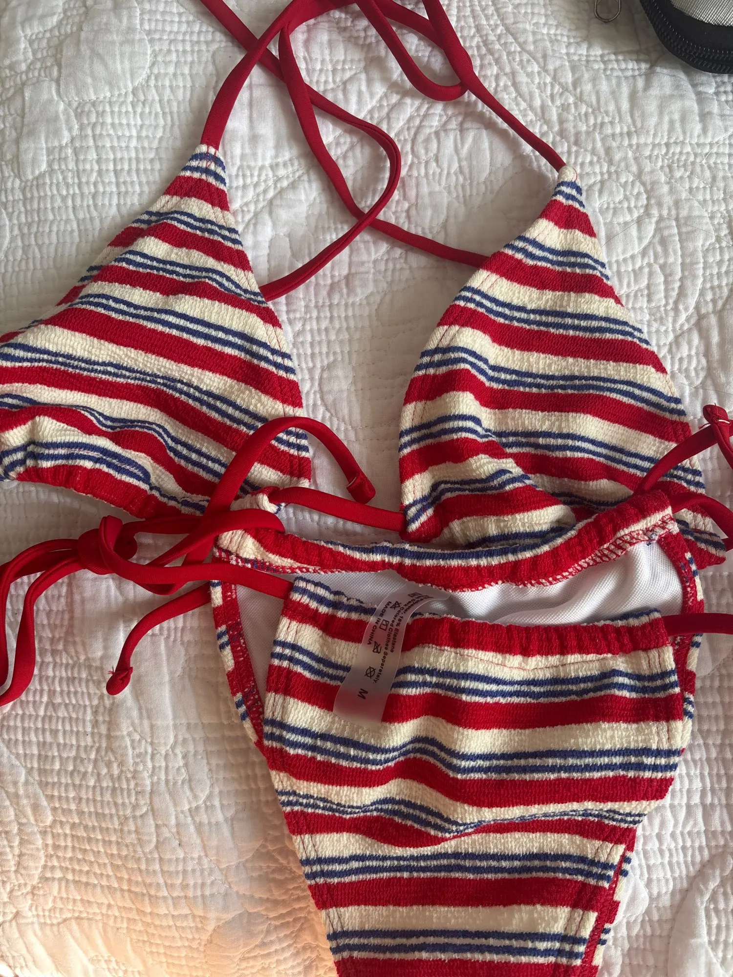 Stripe Print Terry Triangle Halter Tie Side Bikini Set