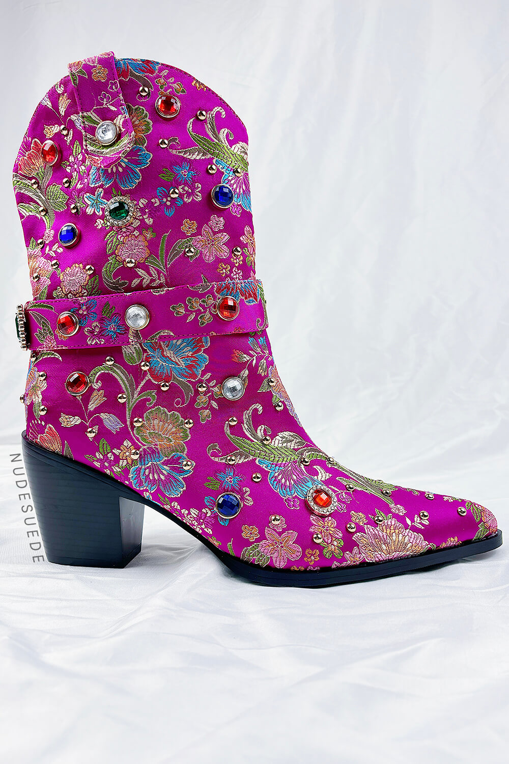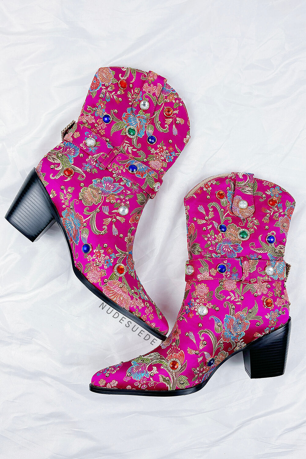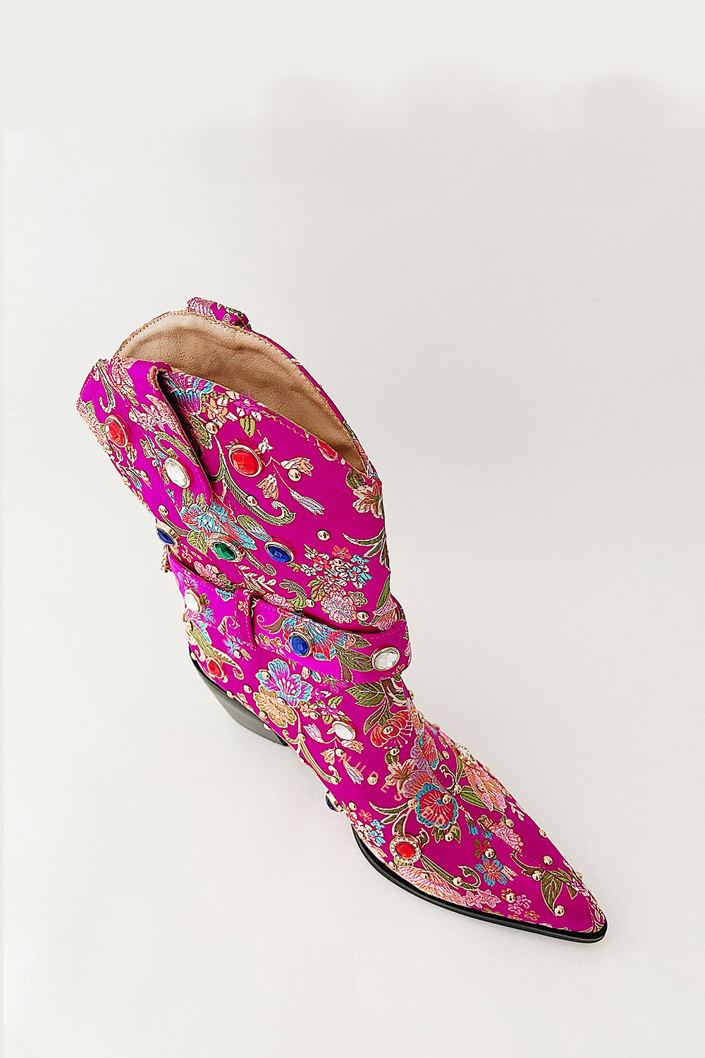 Floral Satin Gemstone-Embellished Pointed Toe Western Ankle Bootie - Pink