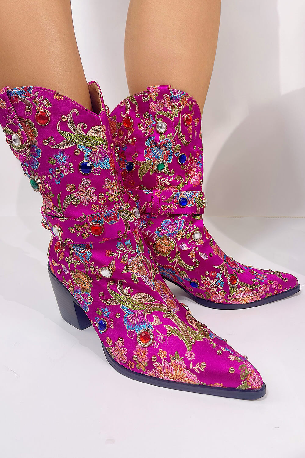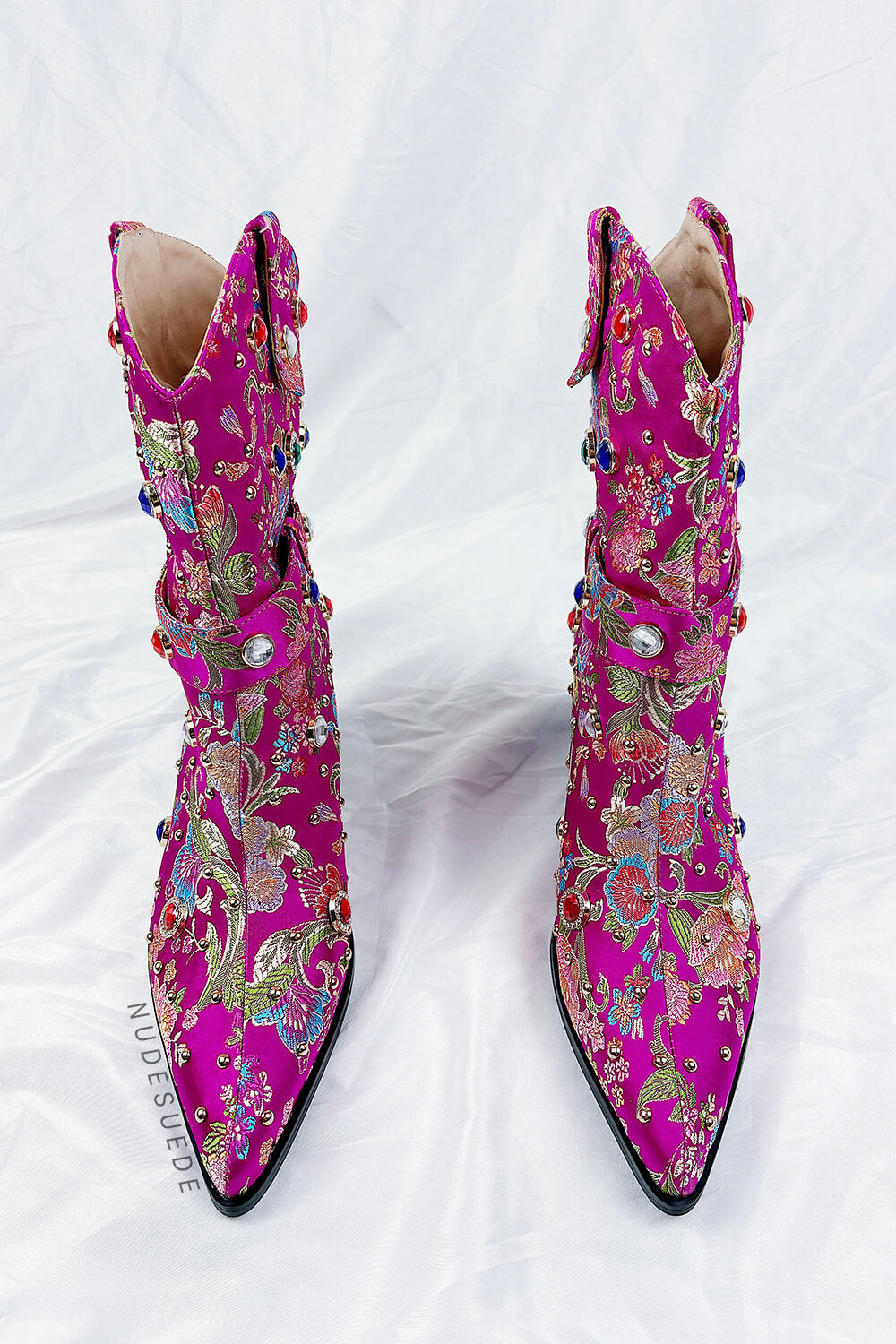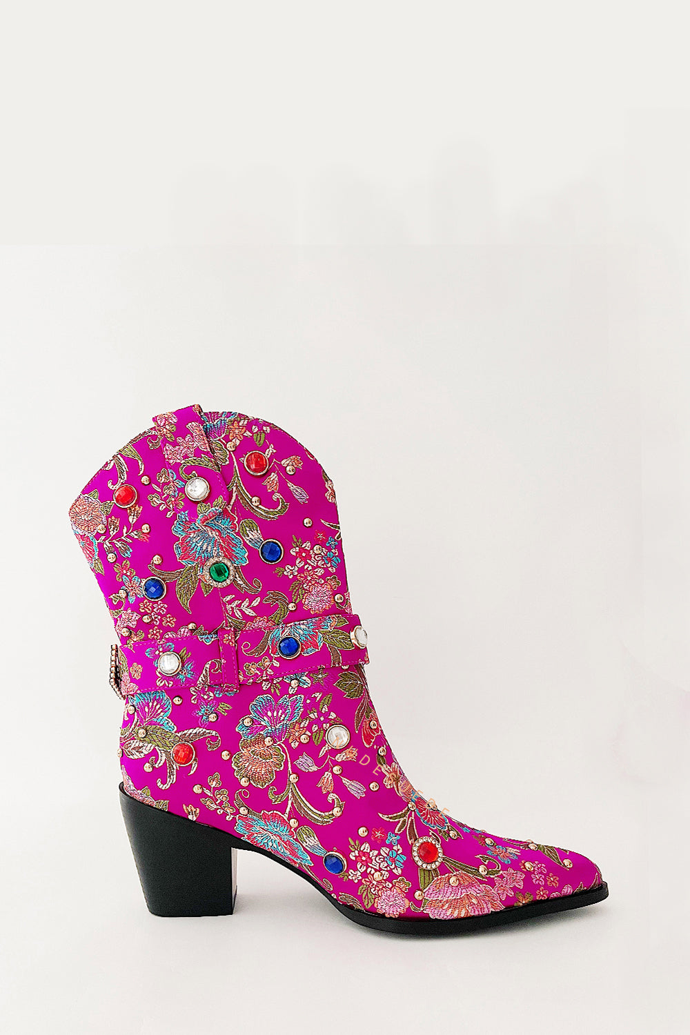 Floral Satin Gemstone-Embellished Pointed Toe Western Ankle Bootie - Pink